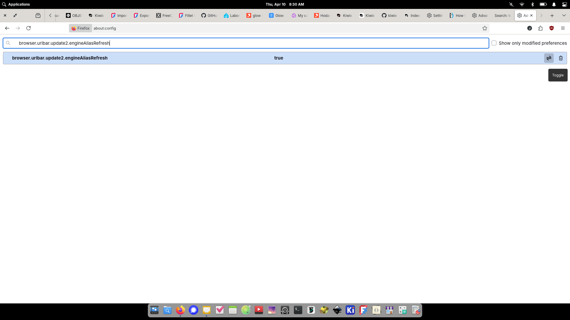 As I alluded to above, Firefox now makes this hard. The first step is to beg permission to add a new search engine, which requires using a secret setting. Open a new tab and type about:config and press enter. In the "Search preference name" field type browser.urlbar.update2.engineAliasRefresh. On the right click the "toggle" button (it looks like two arrows pointing left and right). Now you should be able to go to the regular Settings page and add a new search engine.